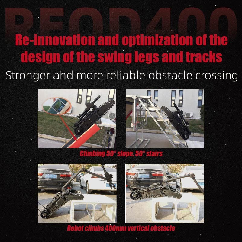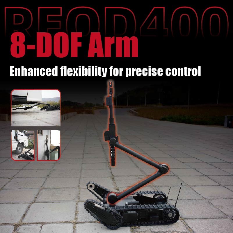 Ο ρομποτικός βραχίονας REOD400 διαθέτει έναν ολοκληρωμένο σχεδιασμό 8 βαθμών ελευθερίας, παρέχοντας ισχυρές δυνατότητες χωρικής εμβέλειας. Αυτός ο σχεδιασμός επιτρέπει στον ρομποτικό βραχίονα να εκτελεί όχι μόνο συμβατικές εργασίες εξουδετέρωσης βομβών, αλλά και λειτουργίες που τα συμβατικά ρομπότ εξουδετέρωσης βομβών 5 ή 6 βαθμών ελευθερίας δεν μπορούν να χειριστούν, όπως η αρπαγή αντικειμένων σε περιβάλλοντα υψηλής, χαμηλής, βαθιάς τάφρου ή επιτραπέζια, καθώς και η διεξαγωγή αναγνώρισης πολλαπλών γωνιών σε περιβάλλοντα υψηλής, χαμηλής και βαθιάς τάφρου.